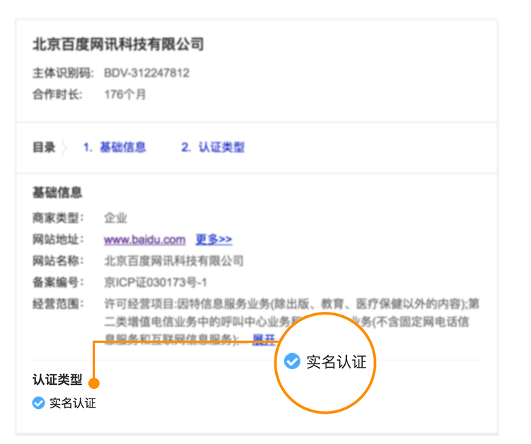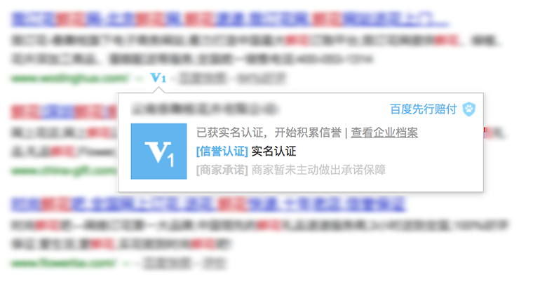 認(rèn)證成功的企業(yè)將獲得百度商家信譽(yù)評級,擁有量身定制信譽(yù)檔案,并在百度搜索結(jié)果展示藍(lán)色V標(biāo)。